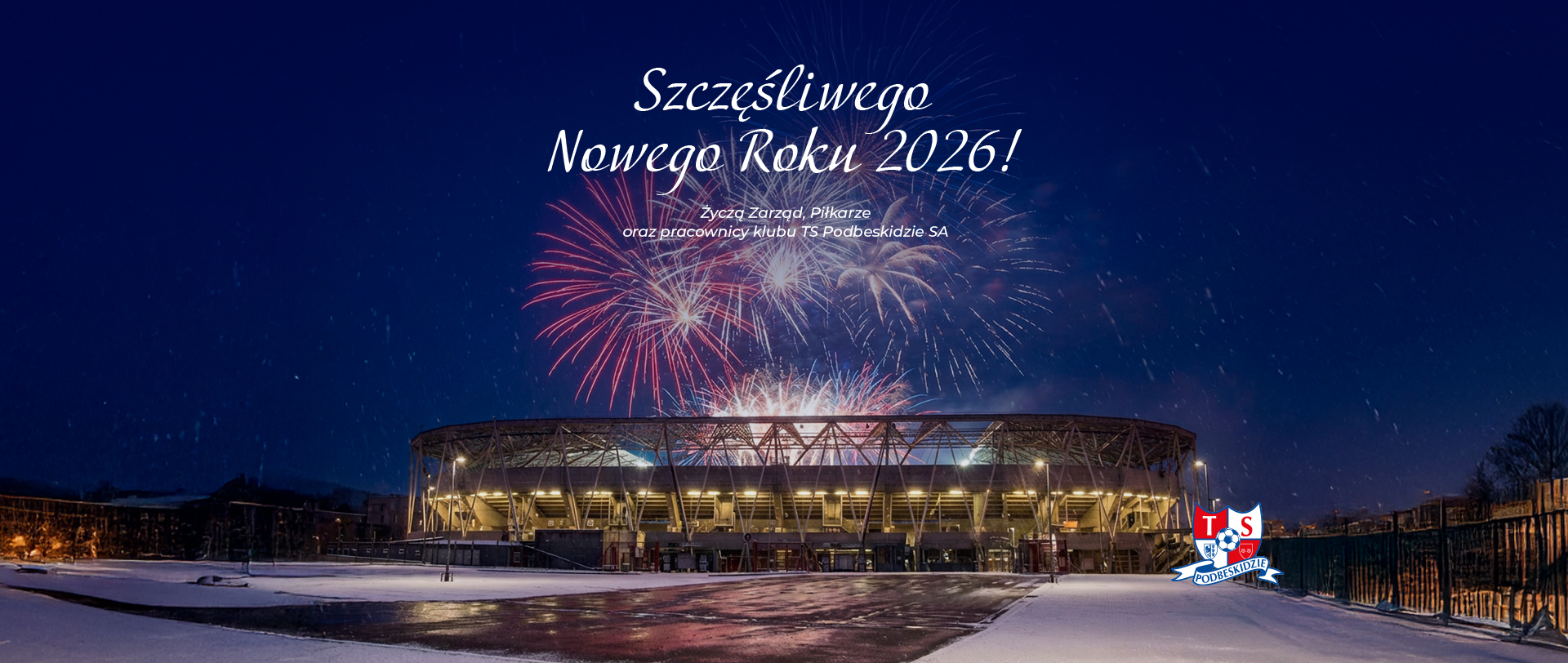 Wszystkim sponsorom Podbeskidzia, partnerom, kibicom i osobom, mającym czerwono-biało-niebieskie barwy w sercu, pragniemy życzyć szczęśliwego nowego roku 2026!